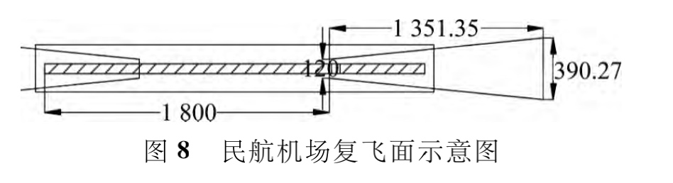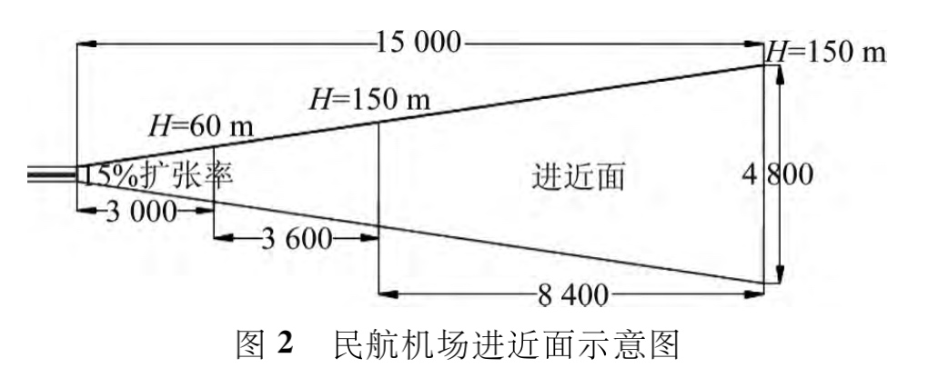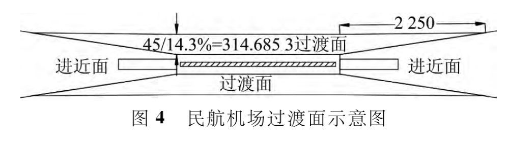 起始边线位于入口内1800m处,内边宽度120m,两侧边扩散率均为10%,坡度为3.33%,外边线终止与内水平面高度45m。起算标高取对应跑道入口端中点高程。
