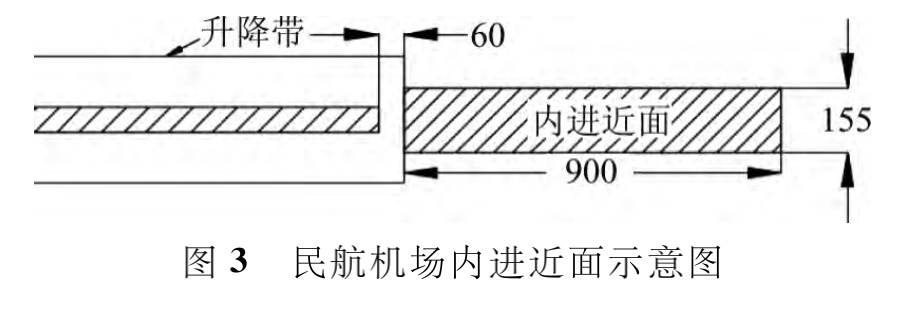 为进近面中紧靠跑道入口前的一块长方形斜面,距跑道 端前60m,宽度为155m,长度为900m,坡度为2%。 起算标高取对应跑道入口端中点高程。