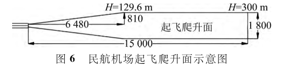为飞机起飞离地端前一个倾斜的平面;分为两段,第一段跑道端前60m,起始宽度180m,按12.5%的扩展率沿跑道中线延长线两侧扩大,总宽度1800m,长度6480m;第二段从第一段的末端开始,保持1800m宽度延伸至长度8520m。起飞爬升面总长度为15000m,坡度为2%。其起算标高取对应跑道端标高。