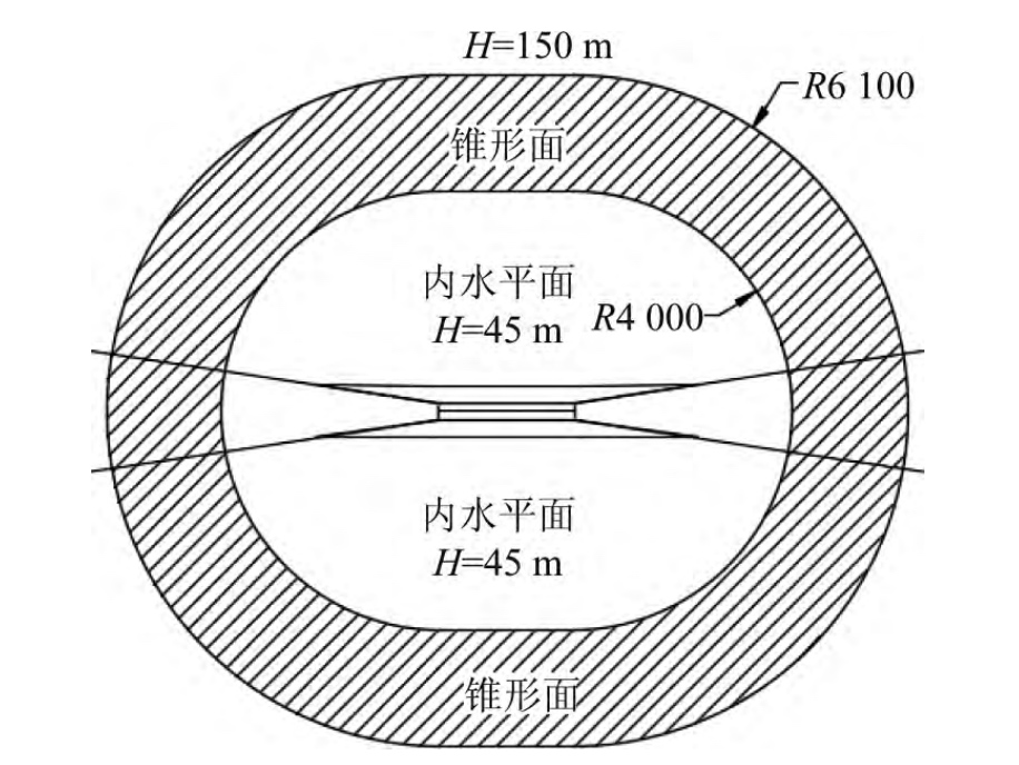 为从内水平面周边向上和向外按5%梯度延伸至150m的倾斜面,其起算标高为内水平面的标高。