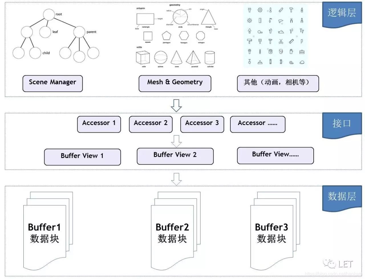 glTF的整体设计,概括有四点:第一,数据块(Buffer)连续,保证了读写性能;第二,提供了视图(View)和访问器(Accessor)的概念,在不损失数据块完整性的前提下提供类型信息和读取规范,保证了兼容性;第三,逻辑层和数据层分离,两者尽量分离,比如用户想要增加一种风格,只会牵连到逻辑层的调整,不会影响数据层的读写,保证了独立性;第四,逻辑层,也就是业务层是JSON形式,保证了扩展性。