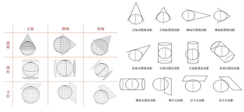 正轴投影:投影面中心轴与地轴相互重合 斜轴投影:投影面中心轴与地轴斜向相交 横轴投影:投影面中心轴与地轴相互垂直 相切投影:投影面与椭球体相切 相割投影:投影面与椭球体相割