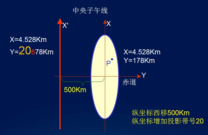 为了便于地形图的测量作业,在高斯-克吕格投影带内布置了平面直角坐标系统,具体方法是,规定中央经线为X轴,赤道为Y轴,中央经线与赤道交点为坐标原点,x值在北半球为正,南半球为负,y值在中央经线以东为正,中央经线以西为负。由于我国疆域均在北半球,x值均为正值,为了避免y值出现负值,规定各投影带的坐标纵轴均西移500km,中央经线上原横坐标值由0变为500km。为了方便带间点位的区分,可以在每个点位横坐标y值的百千米位数前加上所在带号。